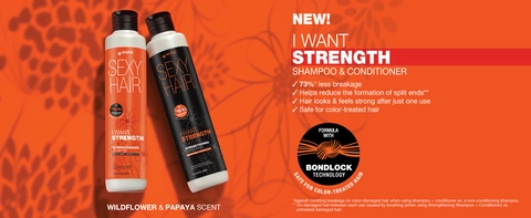 SexyHair I WANT STRENGTH Strengthening Shampoo. This formula with BondLock Technology* includes ingredients that help nourish and strengthen hair by reducing breakage up to 73%* and helping to reduce the formation of split ends** on damaged hair between each use.