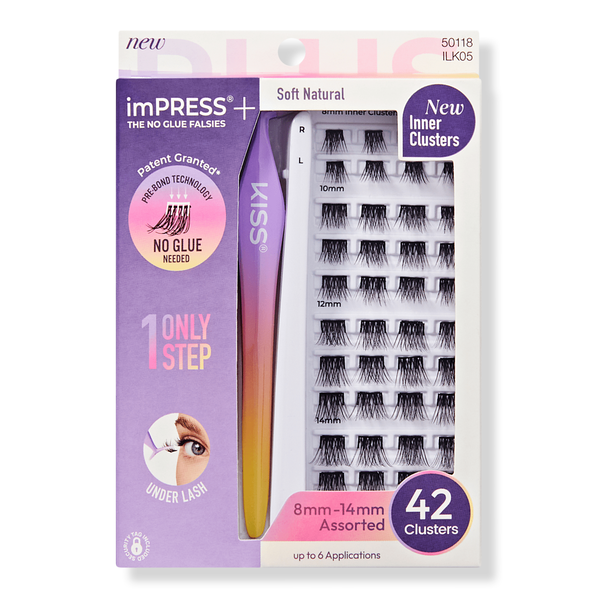 Lash in a flash with NO GLUE NEEDED! imPRESS Press On Lashes, with Pre-Bonded Breakthrough Technology, now come with inner clusters for precise placement on your inner eye. Press on under-lash application lets you lash in 1 simple step.