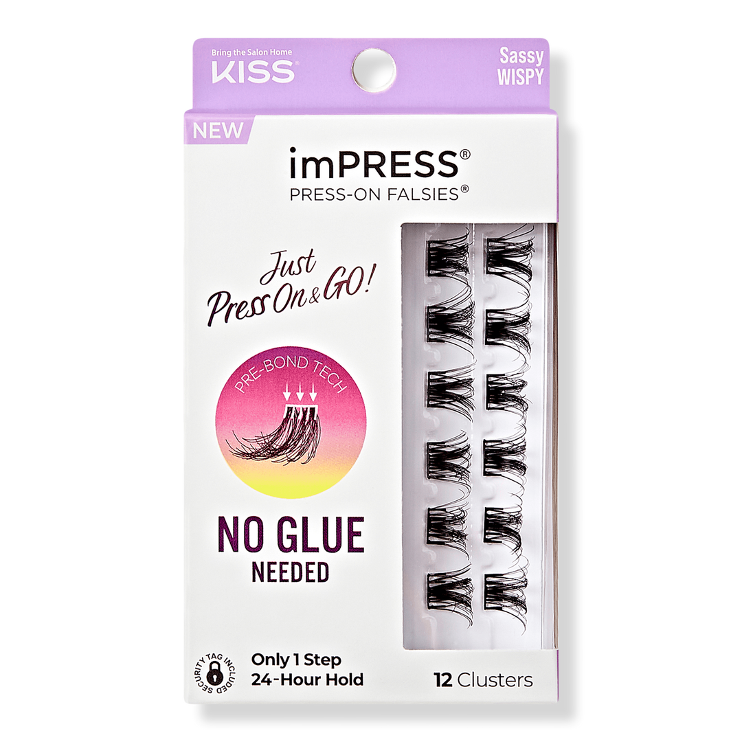 Customize your look with more 'no glue needed' Press On and GO styles by Kiss. Minipacks come in Natural, Voluminous, and Wispy looks. ImPRESS Press-on Falsies with Pre-Bonded Breakthrough Technology require NO GLUE to apply, and are a TRUE game changer.
