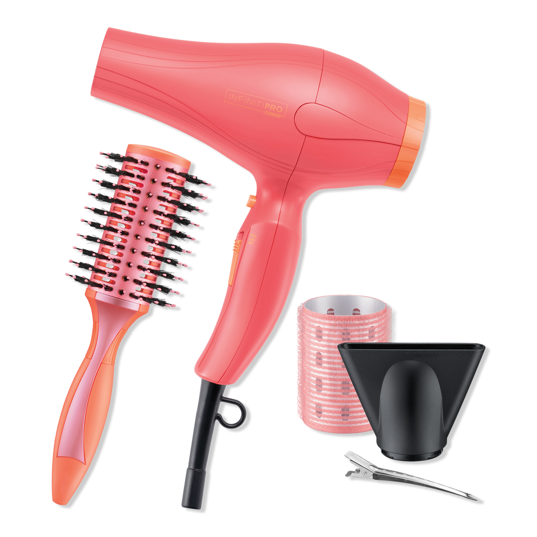Skip the salon and create a flawless blowout with the InfinitiPRO By Conair 17-Piece Blowout Kit. Includes pro dryer, diamond-infused round brush, thermal rollers, and styling tools. Boost volume, shape, and style with everything you need.