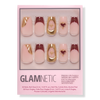 Remove any previously applied nail polish. Wash and dry hands. Gently push back cuticles using the cuticle stick and sanitize nails with alcohol pads. Size Glamnetic nails by placing on finger and select sizes best suited for your natural nails. Apply an even layer of glue to natural nails and the back of Glamnetic nails. Align Glamnetic nails with cuticle line and apply at a downward angle. Press down firmly and hold for 10-20 seconds. Apply all 10 nails and if needed, file or clip to achieve desired shape.