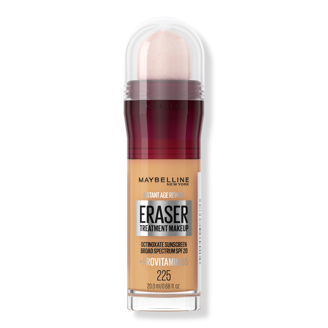 Maybelline New York's Instant Age Rewind Eraser Treatment Foundation with SPF 20 blurs early signs of aging in an instant. The blurring sponge-tip applicator delivers medium coverage. This moisturizing foundation with provitamin B5 goes on smooth for a creaseless, natural finish that lasts.