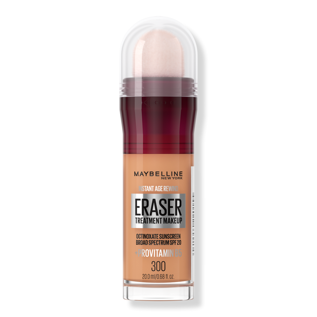 Maybelline New York's Instant Age Rewind Eraser Treatment Foundation with SPF 20 blurs early signs of aging in an instant. The blurring sponge-tip applicator delivers medium coverage. This moisturizing foundation with provitamin B5 goes on smooth for a creaseless, natural finish that lasts.