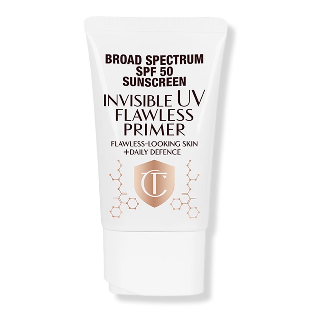 Charlotte Tilbury's Invisible UV Flawless Primer SPF 50 is an invisible, weightless, scentless primer, with broad-spectrum SPF 50 and hyaluronic acid, that primes, supports, and hydrates skin.