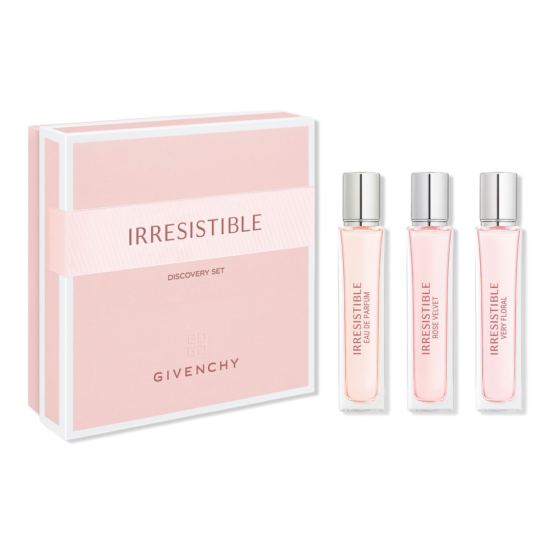 Indulge in elegance with Givenchy's Irresistible Discovery set featuring Irresistible Eau De Parfum, Irresisitble Rose Velvet Eau De Parfum and Irresistible Very Floral Eau De Parfum travel sprays.