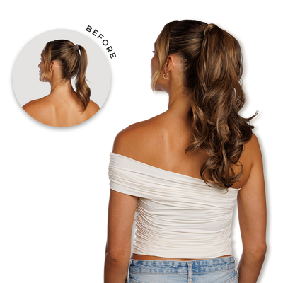 Step 2: Insert the built-in comb at the base of your ponytail (comb faces upwards between your scalp and the hair tie).