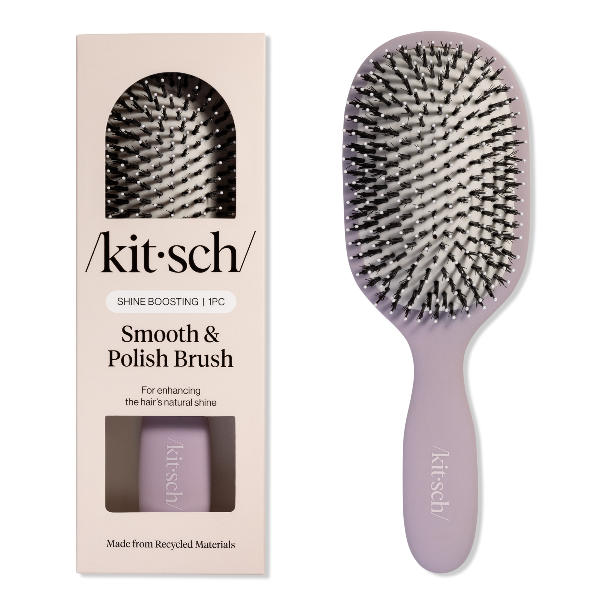 Kitsch Smooth & Polish Brush combines vegan boar and nylon bristles to detangle, smooth, and add shine. Gentle on scalp with a cushioned pad, it reduces frizz, flyaways, and breakage while distributing natural oils for healthier, polished hair.