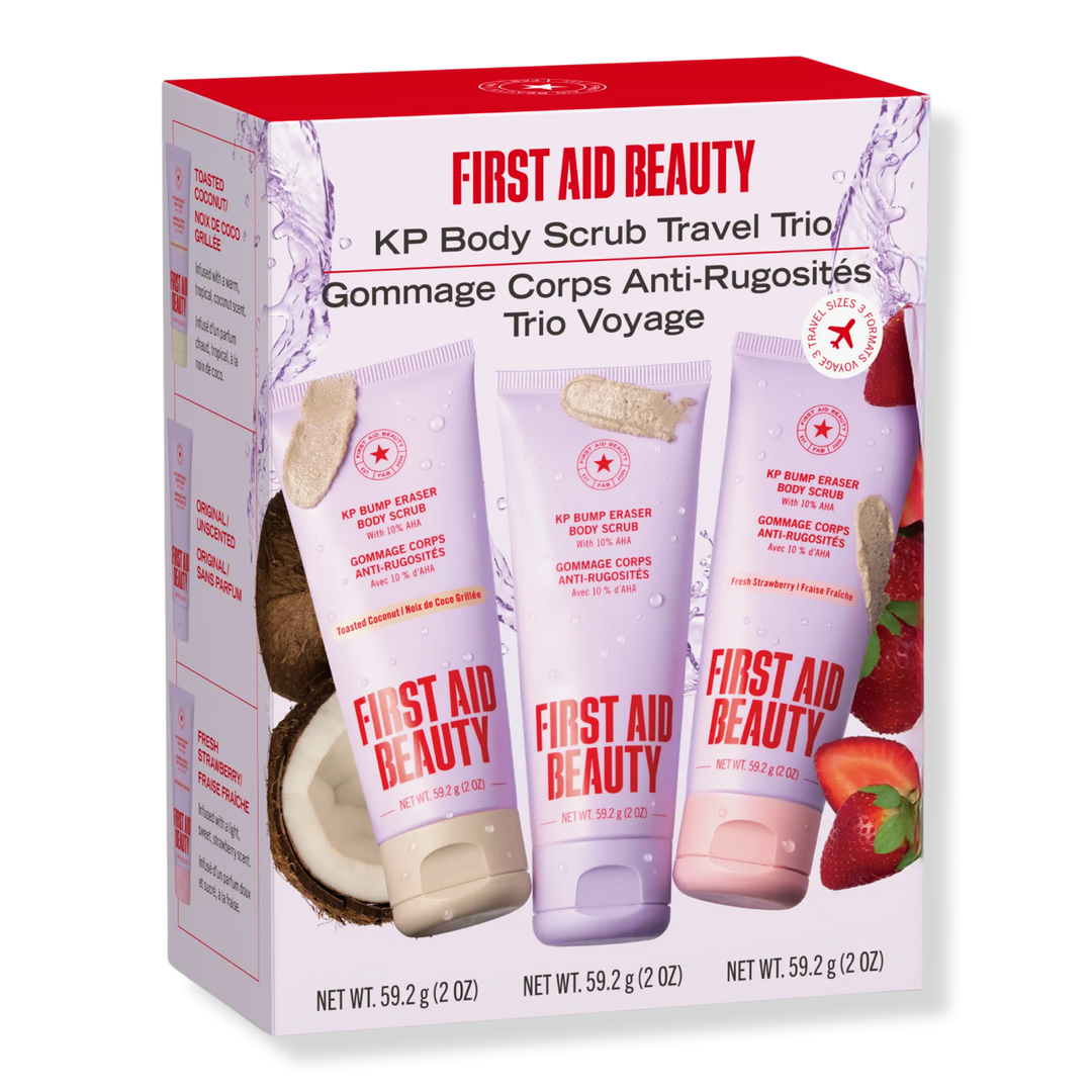 First Aid Beauty’s KP Body Scrub Travel Trio includes three travel size body scrubs that exfoliate to reveal visibly smoother, healthier and radiant skin.