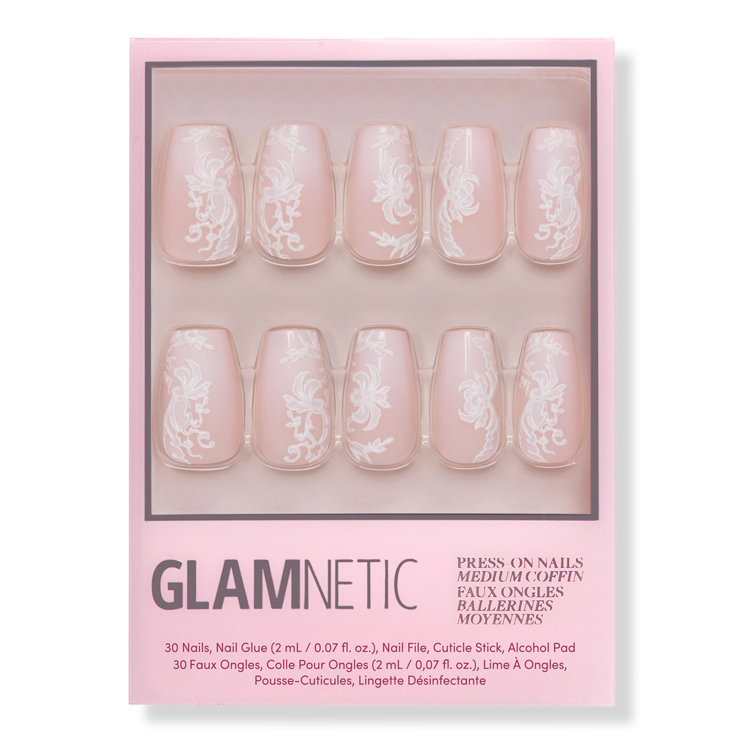 Channel vintage romance with Glamnetic's Lace Blush. These nails showcase a dreamy nude-to-white ombre with intricate raised lace detailing. Perfect for romantic evenings, or a simple touch of sophistication, this opaque matte & glossy combination offers a refined look with antique charm.