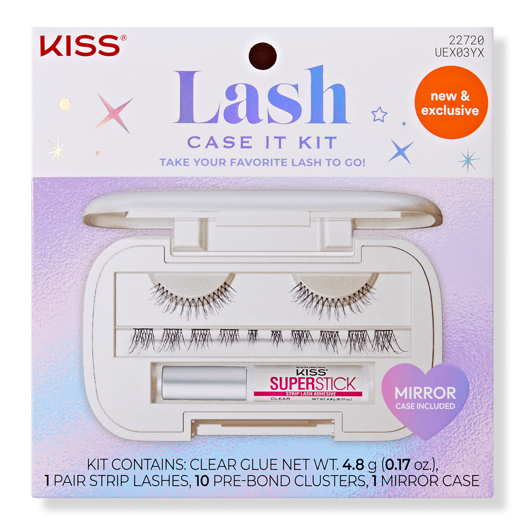 Glam made easy. This festive Kiss Lash Case It Kit has all the essentials for easy eye looks on the go—natural-looking strip lashes, long-lasting patented pre-glued clusters, and an ultra-strong clear adhesive to keep your style in place.