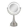 11 inches wide by 5.5 inches deep by 18 inches tall. LED ring light. Adapter powered or cordless battery face mirror. Dual-sided 10-time and 1-time magnifications. Mirror head swivels 360 degrees.