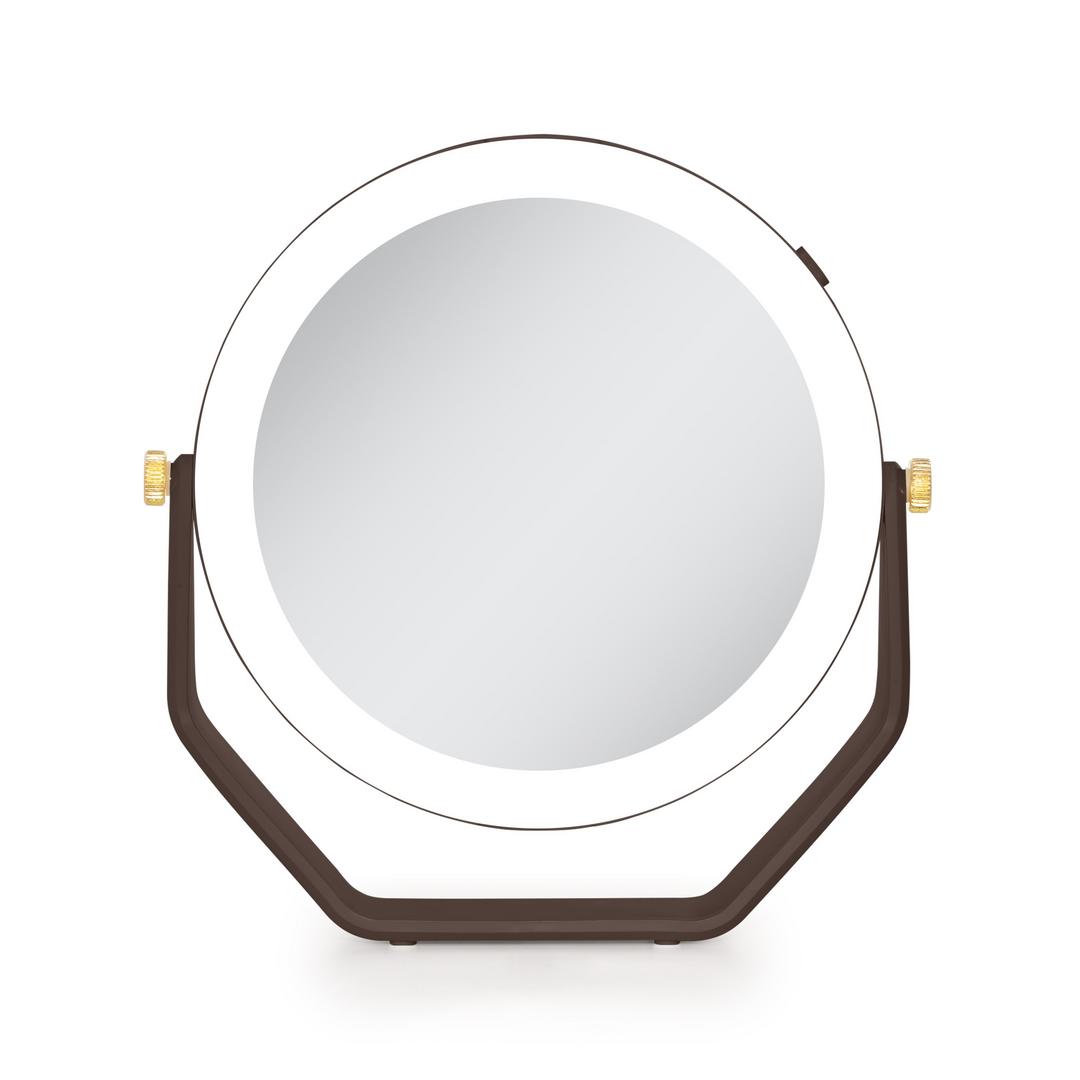 Double-sided 5-times and 1-time magnification mirror with lights. 360 degree rotation beauty mirror head. Cool white LED ring lighting. Stylish gold joint accents. Easy-touch On/Off button. 5.75-inch dia. glass mirror head. 5 AAA batteries required.
