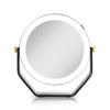 Double-sided 5-times and 1-time magnification mirror with lights. 360 degree rotation beauty mirror head. Cool white LED ring lighting. Stylish gold joint accents. Easy-touch On/Off button. 5.75-inch dia. glass mirror head. 5 AAA batteries required.