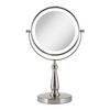7.5-inch by 12.5-inch. 6.5-inch dia. mirror head. 5.25-inch dia. glass face mirrors. 8-times and 1-times magnifications. Cool white color temperature ring light. 360-degree swiveling mirror head. Cordless battery operated. 4 AAA Batteries not included.