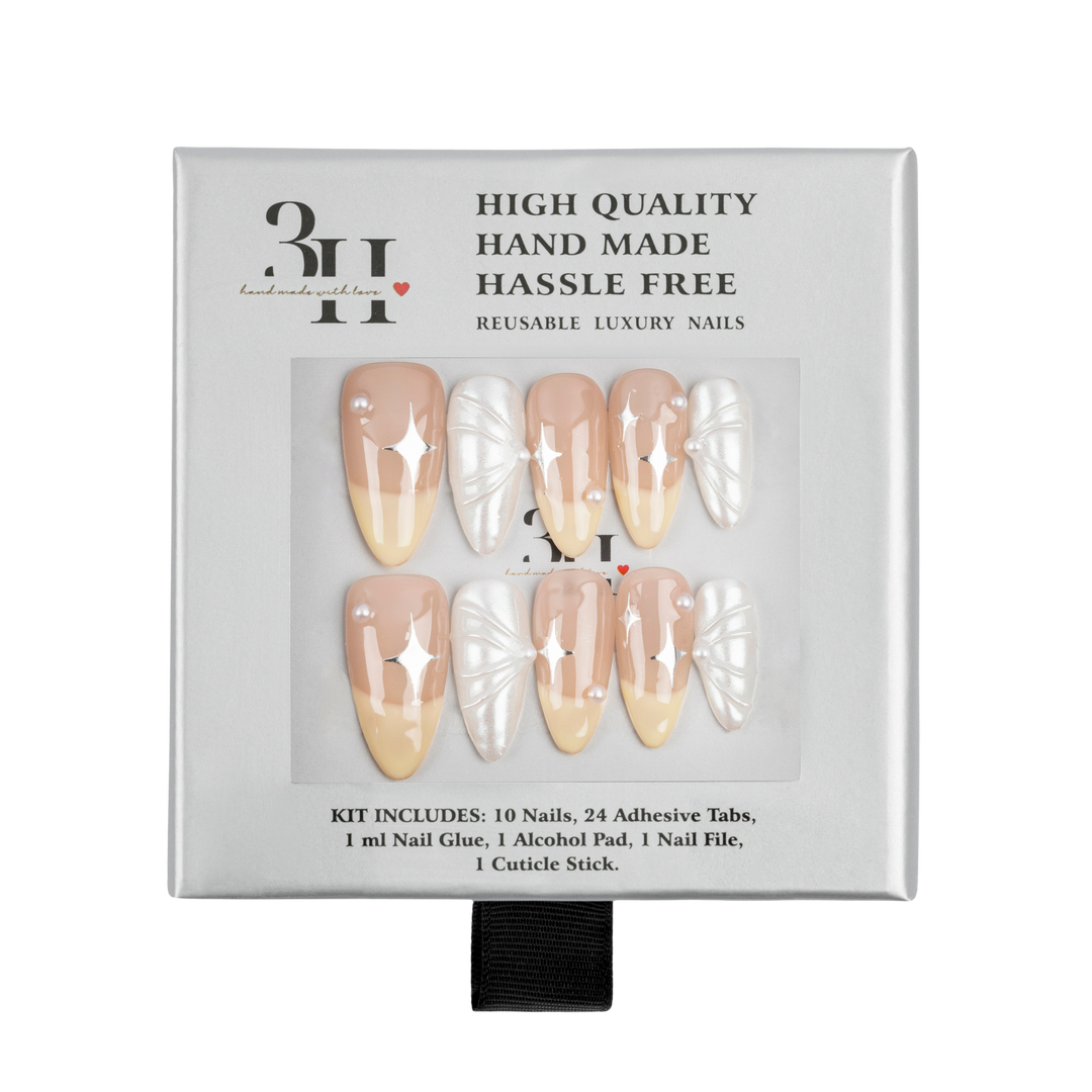 Pastel yellow French tips with pearly designs and sleek silver sparkle motifs. A fresh, playful design crafted from high-quality materials. Reusable and perfect for everyday or standout moments.