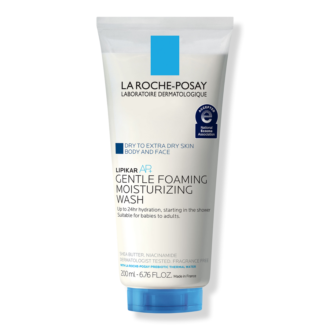 La Roche-Posay Lipikar Wash AP+ Gentle Foaming Moisturizing Wash is a hydrating face cleanser and body wash that provides 24-hour hydration for dry skin.