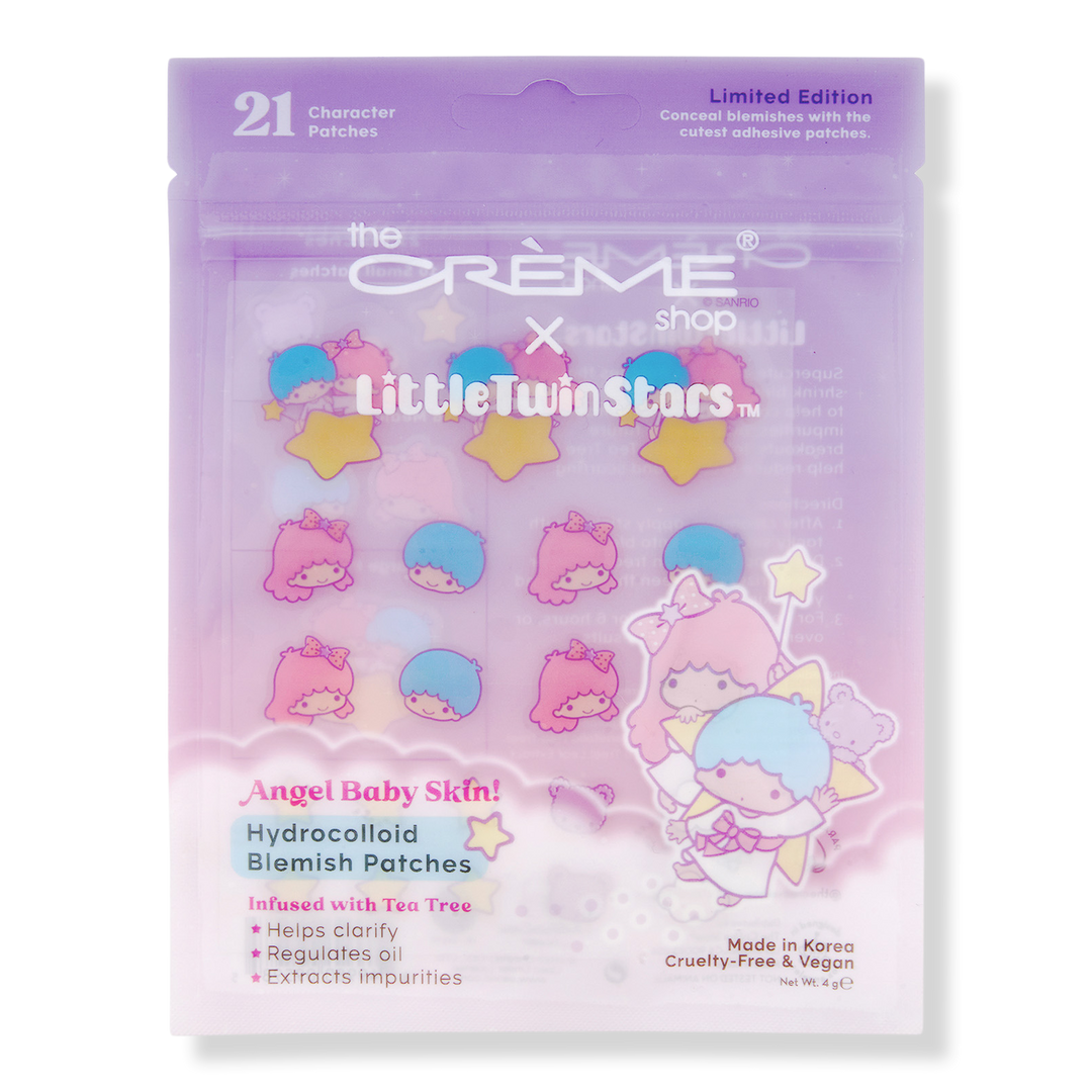 Supercute The Crème Shop x Little Twin Stars Angel Baby Skin! Hydrocolloid Blemish Patches adhesive patches that help shrink blemishes. Wear over makeup to help conceal pimples, extract impurities, and prevent future breakouts. Infused with Tea Tree to help reduce redness and scarring.