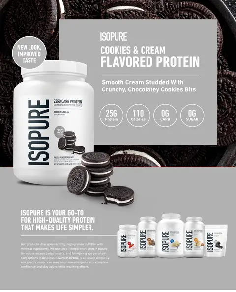 ISOPURE Protein Powder delivers 25g of high-quality, smooth and delicious protein in every serving for an effortless way to get the nutrition you want each day. Made with ultra-filtered 100% whey protein isolate, each scoop also serves up 20 vitamins and 0g sugar.