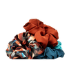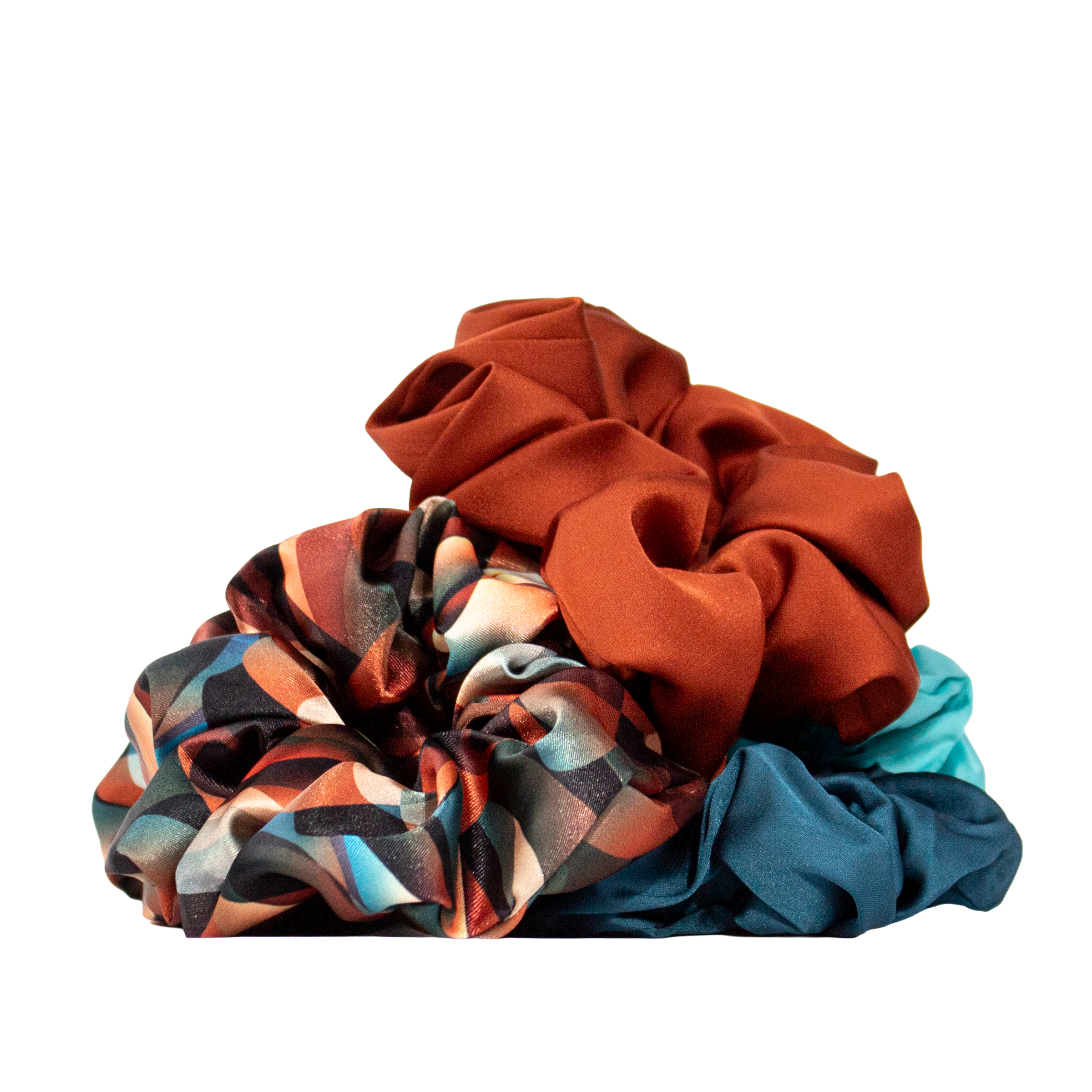 Soft double-layer satin scrunchies that protect hair and reduce breakage; limited edition 5-pack from RevAir's Cinnamon Swirl collection.