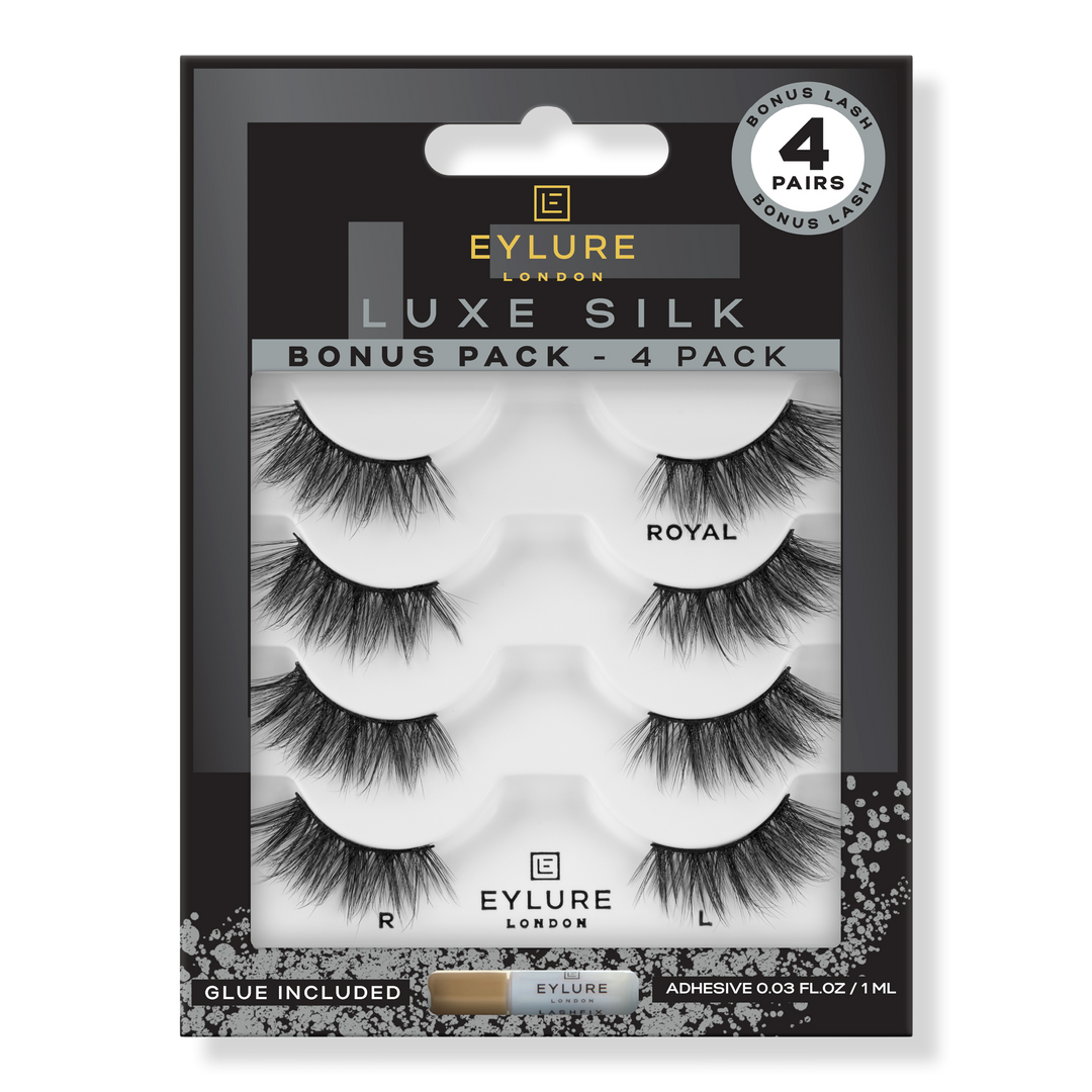 You're about to look like royalty and feel like it too with silky and elevated Eylure Luxe Silk Royal Eyelashes Multipack. This multipack includes four pairs of luxurious false eyelashes along with long-lasting adhesive that's easy to apply.