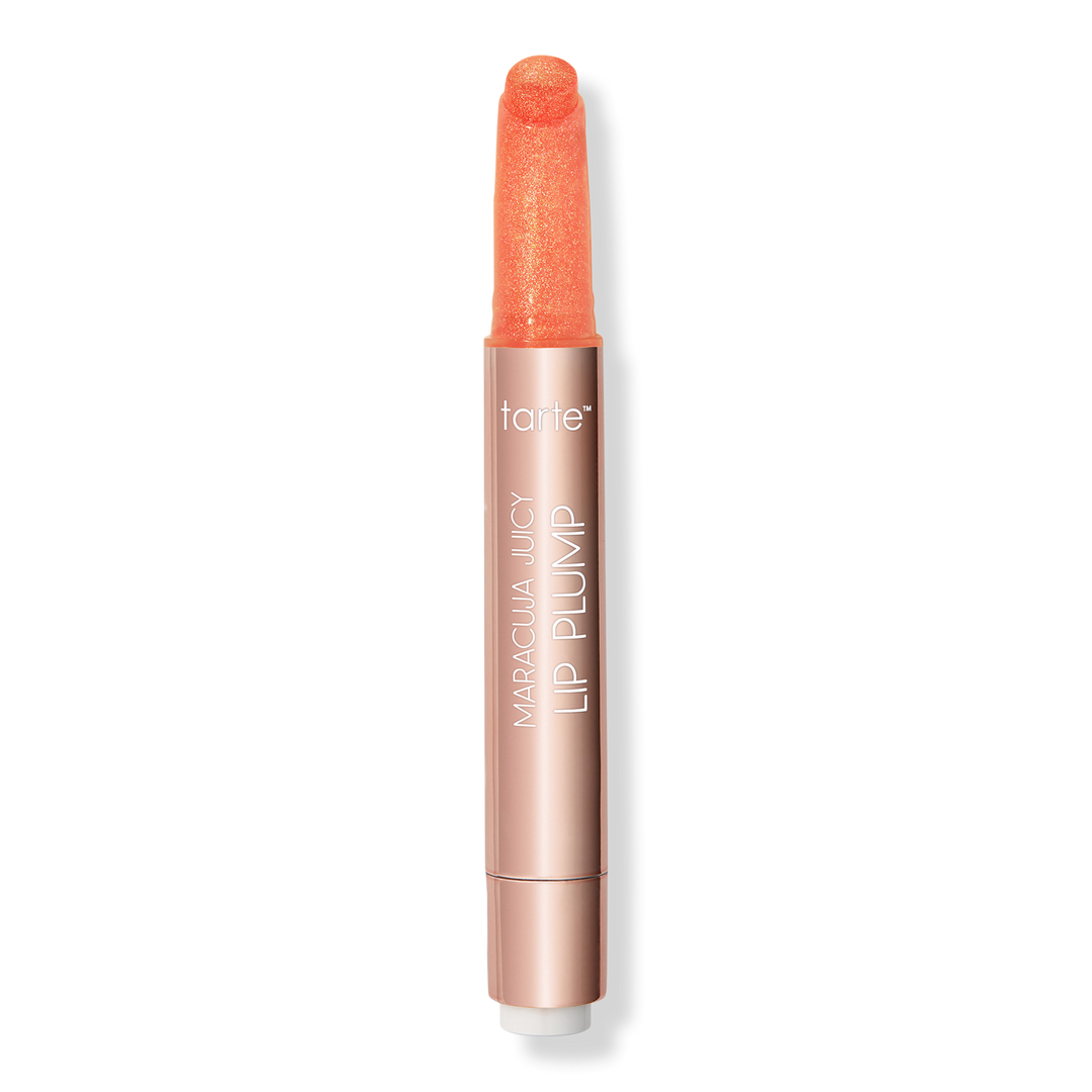 tarte's Maracuja Juicy Shimmer Glass Lip Plump is all-in-1 plumping balm, gloss, color & hydrating treatment with buildable coverage & a shimmer plump finish!