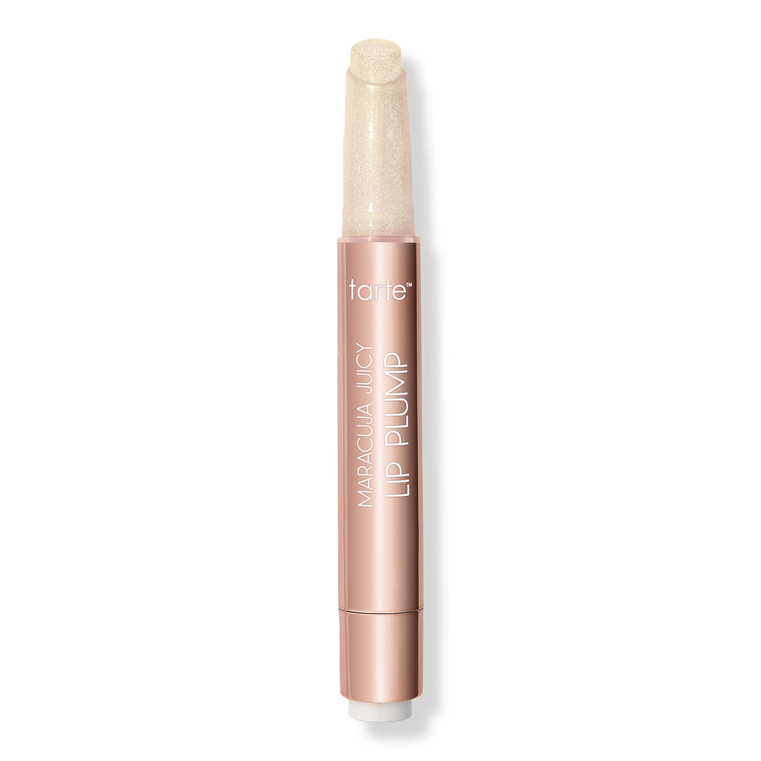 tarte's Maracuja Juicy Shimmer Glass Lip Plump is all-in-1 plumping balm, gloss, color & hydrating treatment with buildable coverage & a shimmer plump finish!