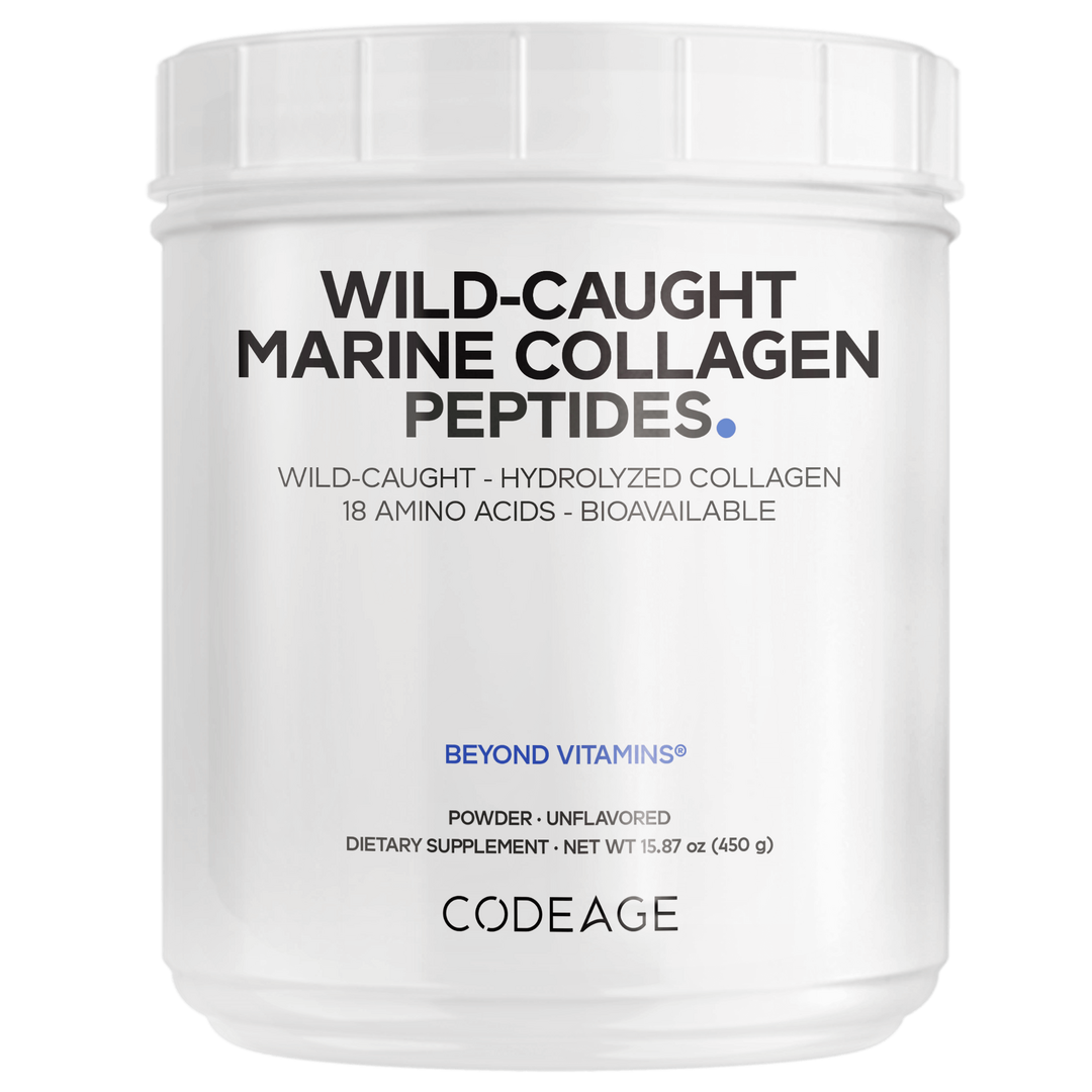 Codeage Wild Caught Marine Collagen Peptides Powder is a hydrolyzed collagen supplement sourced from North American ocean white fish, providing types 1 and 3 collagen in a powder format. It is suitable for those seeking a marine-based, meatless collagen powder to support their daily wellness*