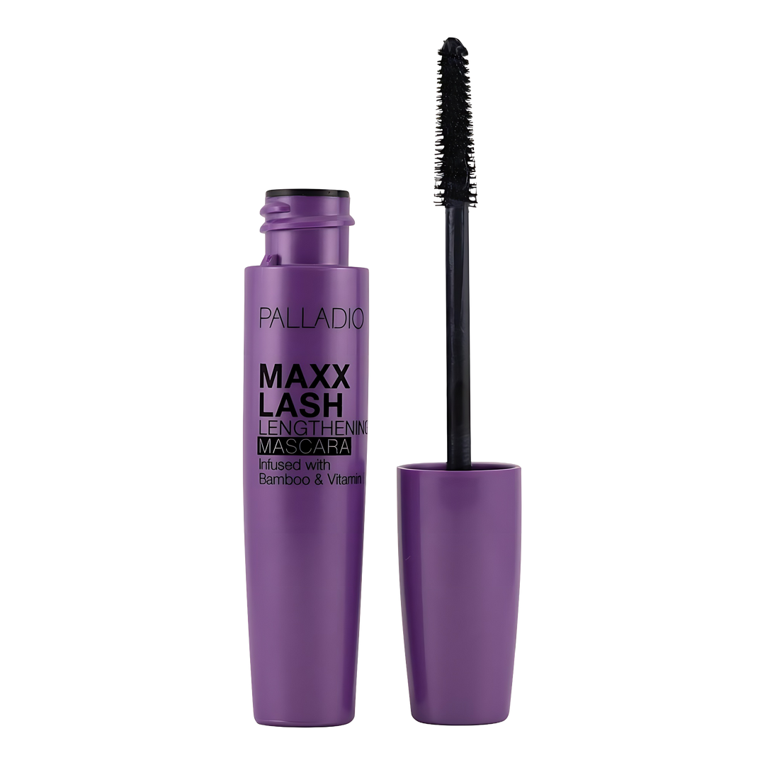 This mascara has a wide-gap wand for incredible lengthening effect and dramatic volume. The ultimate brush for endless length! Lift lashes at the root and help extend even the shortest hairs with Palladio's lengthening Maxxlash Mascara.