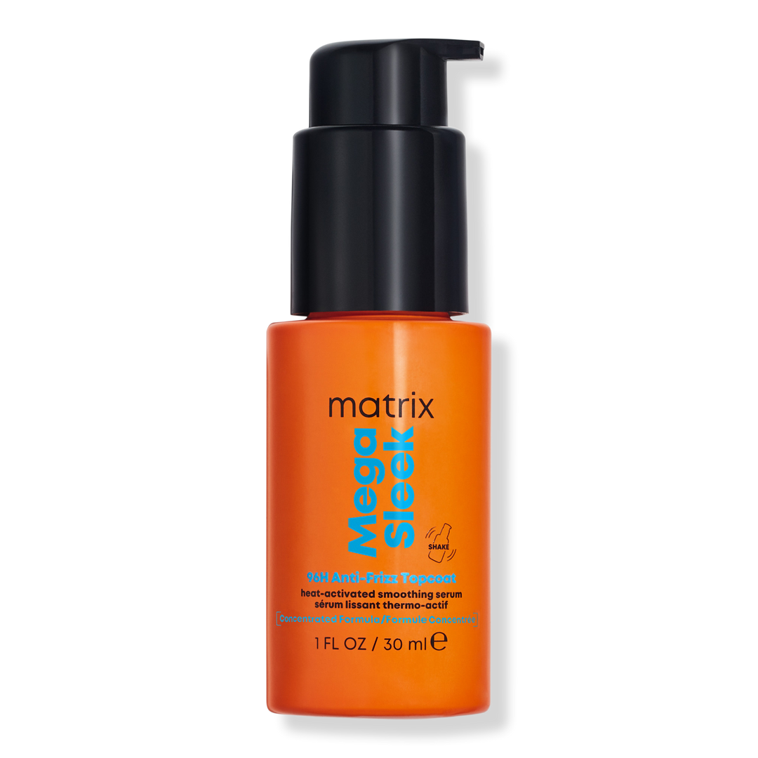 Matrix Mega Sleek Anti-Frizz Topcoat Hair Serum and heat protectant defeats frizz for 96 hours in up to 97% humidity with a heat-activated hydrophobic barrier. This leave in treatment seals hair to defy humidity and provides frizz-prone, vibrant hair shine that lasts up to 5 shampoos.