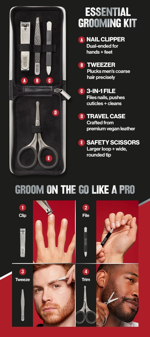 The Revlon Men's Series Essential Grooming Kit is a 4-in-1 grooming kit designed for men's hands, featuring a travel case and four tools.