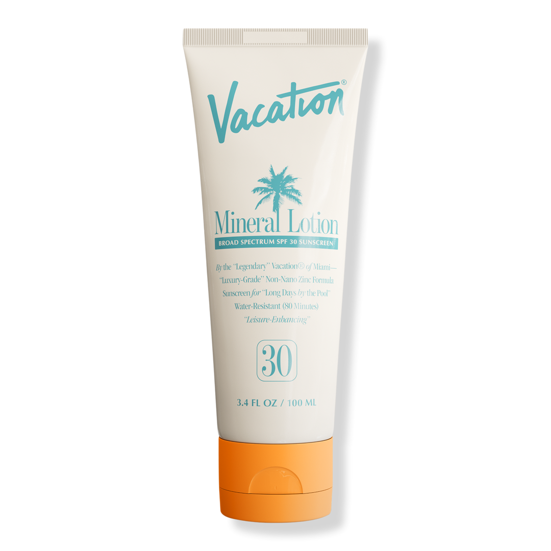 Vacation Mineral Lotion SPF 30 Sunscreen is a non-nano mineral formula with broad spectrum protection made with zinc oxide and a luxurious blend of shea butter and niacinamide (Vitamin B3) for a remarkably smooth and clear application on skin.