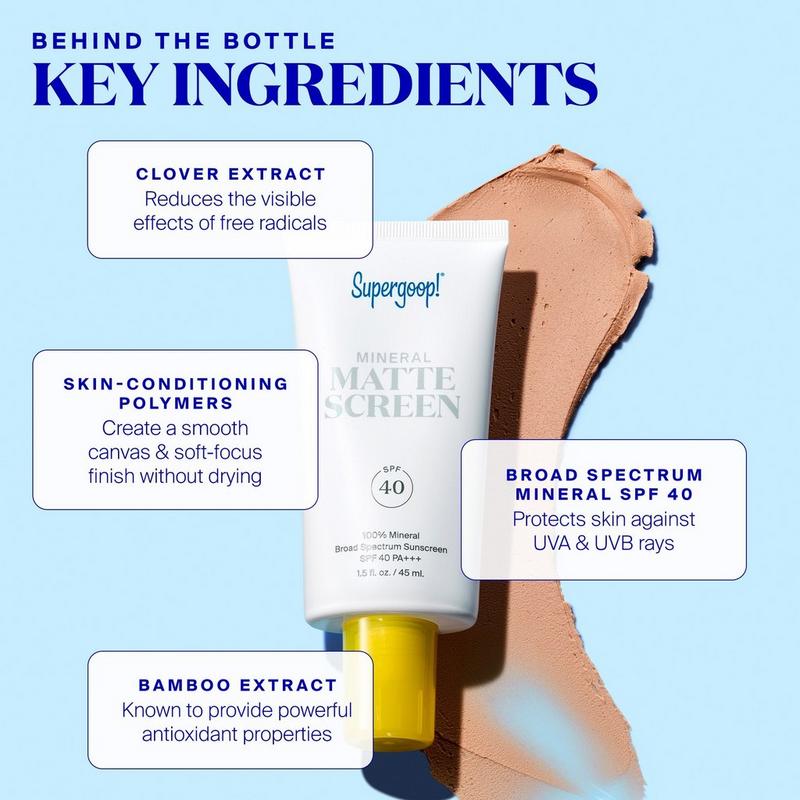 Supergoop! Mineral Mattescreen SPF 40 is a mineral, mattifying tinted sunscreen that primes for makeup, visibly blurs pores, smooths the appearance of skin and provides skincare benefits.