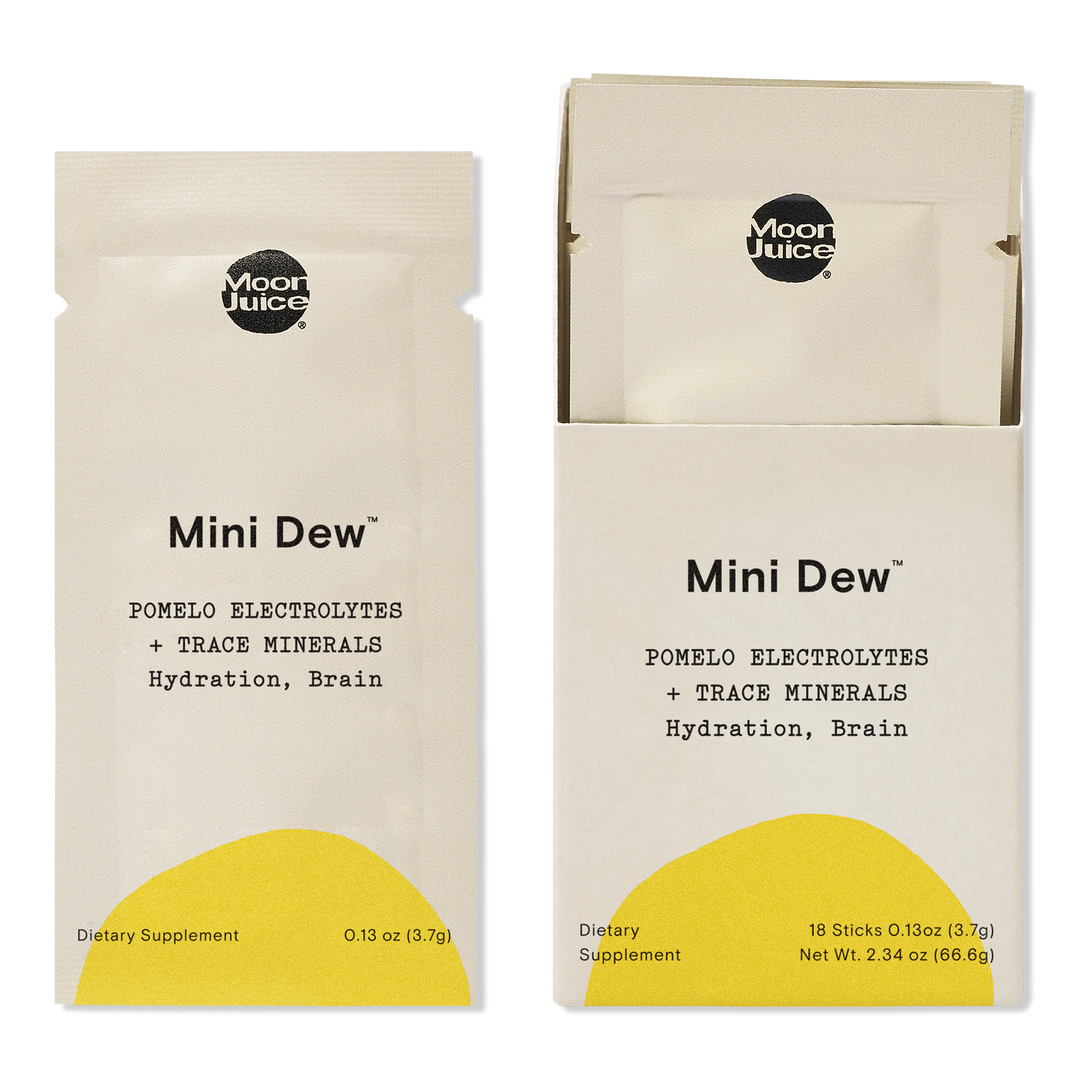 Quench your brain. Moon Juice's Mini Dew Electrolyte + Mineral Supplement is 2 in 1: microplastic-free pink salt electrolytes + minerals for hydration and brain function.