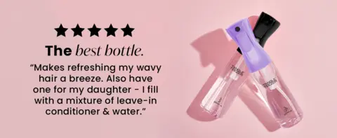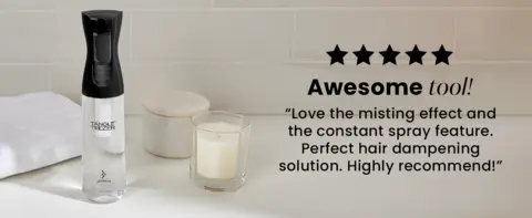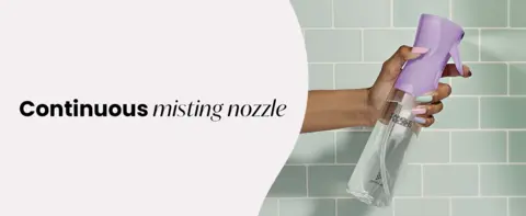 - Refillable water bottle designed to thoroughly dampen hair pre-styling