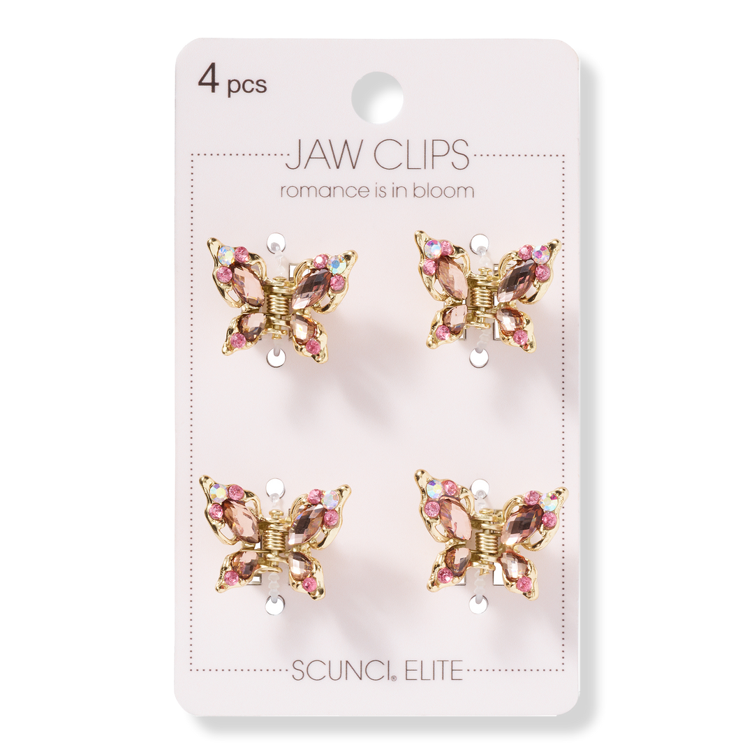 Place a pretty Butterfly-Shaped Jaw Clip in your hair for a nature-inspired look. 4 Scünci Elite gold-tone clips with light pink stones. Medium hold.