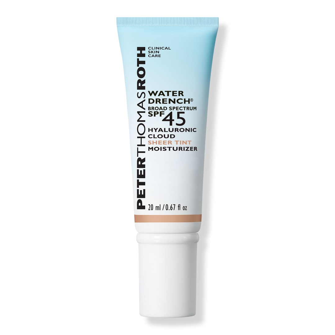 Peter Thomas Roth's Water Drench Hyaluronic Cloud Moisturizer SPF 45 is a water-resistant sunscreen with a hydrating 30% hyaluronic acid complex, unique water-break texture.