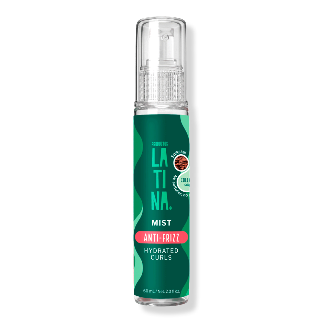 Productos LATINA Mist Anti-Frizz. Rehydrated and defined curls. With collagen and shikakai. Carry it with you in your purse and refresh your curls all day long!