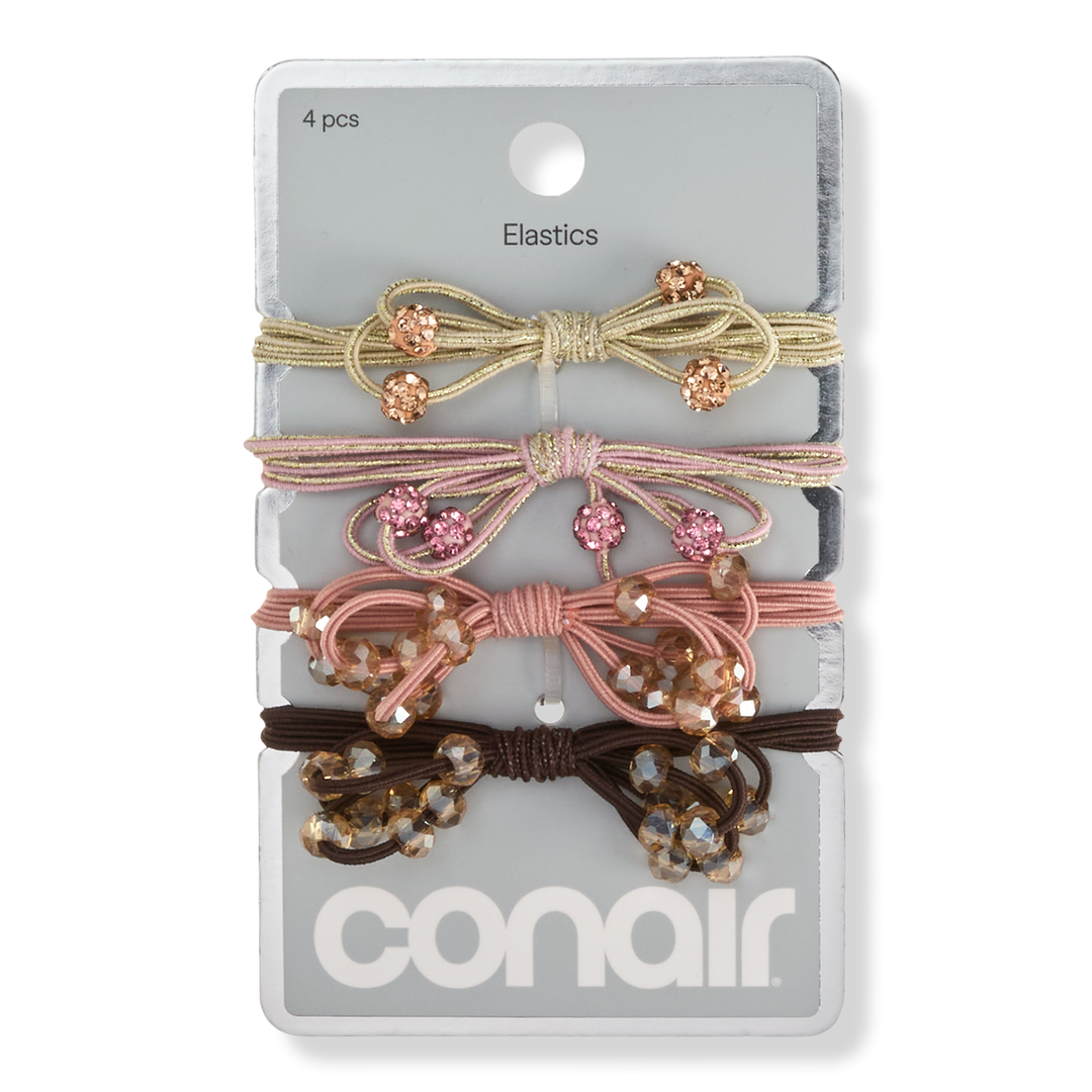 Discover effortless style with this 4-pack of Conair elastic hair ties, finished with bow and sparkle details in a mix of gold, pink, and black. Designed to deliver a pretty look with a secure hold.