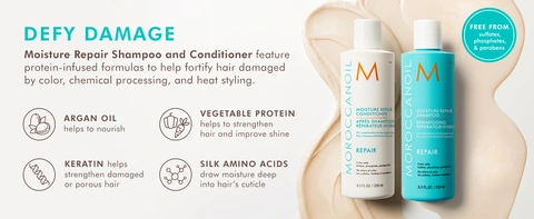 Moroccanoil Moisture Repair Shampoo is infused with protein to fortify and replenish the hair shaft, helping to prevent breakage. Designed for daily care to combat visible signs of damage and promote healthier-looking hair.