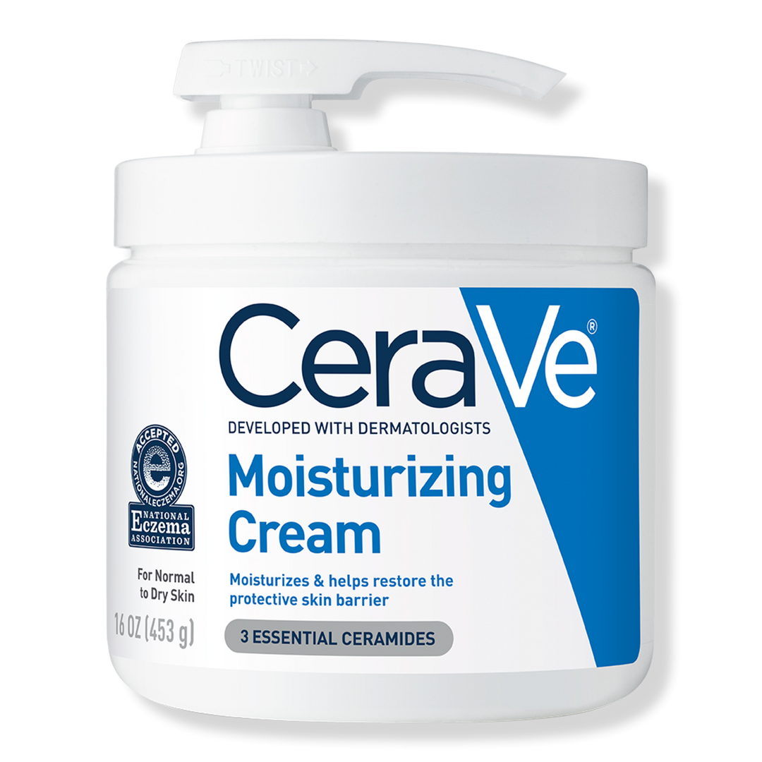 CeraVe Moisturizing Cream for balanced to dry skin with ceramides and hyaluronic acid provides 24-hour hydration for dry skin while replenishing the skin's barrier with ceramides.