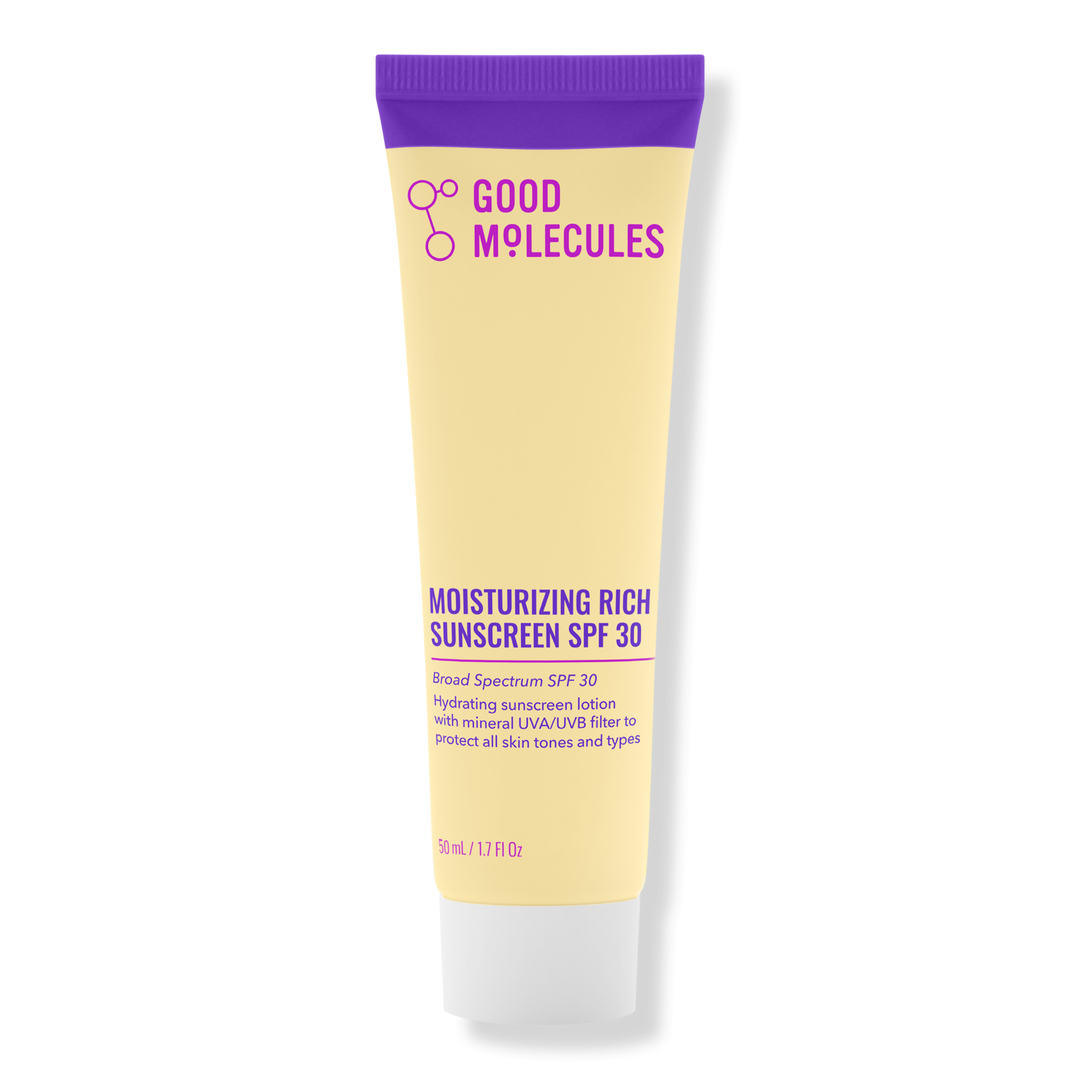 A nourishing mineral sunscreen lotion from Good Molecules with a velvety finish that moisturizes and protects all skin tones and types from harmful UVA and UVB rays.