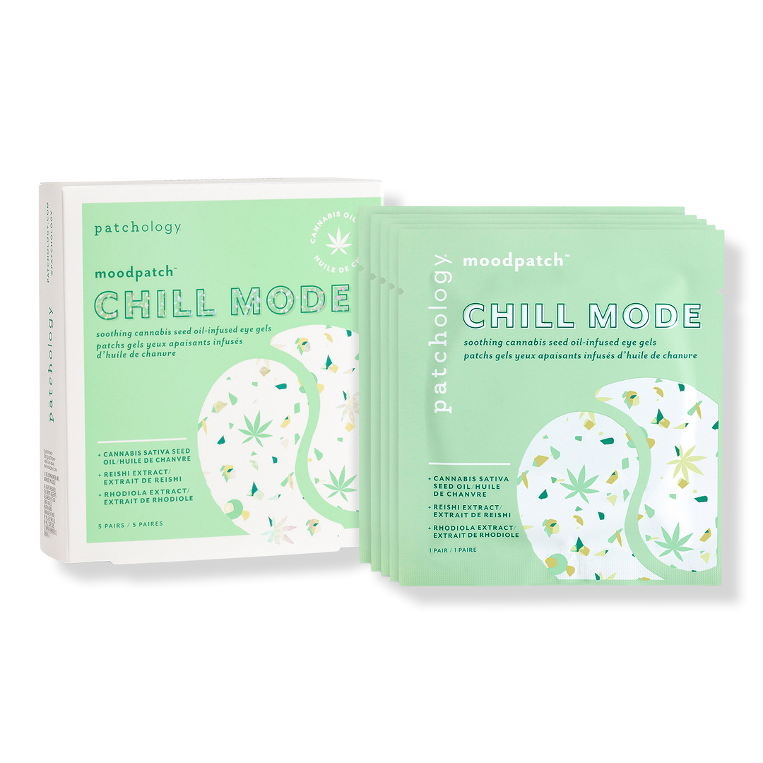 Patchology's moodpatch Chill Mode Eye Gel Patches: Bask in ten minutes of blissful relaxation, while your delicate under eyes are softened, toned, and protected. Formulated with Cannabis Sativa Seed Oil and natural Tea Leaves, these eye gels will lull stressed skin into a state of total relaxation.