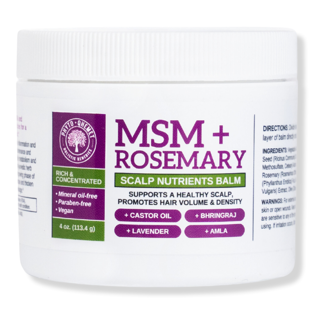 Qhemet Biologics MSM + ROSEMARY Scalp Nutrients Balm boosts blood flow and nutrient delivery to the follicles to tighten roots, minimize shedding and promote healthy hair volume and density.