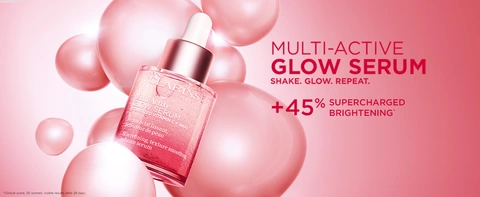Clarins Multi-Active Brightening Glow Serum is a breakthrough bi-phase serum with Vitamin C + AHA for 3 glow-boosting actions. Instantly brighten, even tone + smooth texture.* Refine pores in 28 days.**