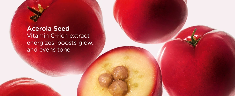 - Acerola Seed: Vitamin C-rich extract energizes, boosts glow, and evens tone