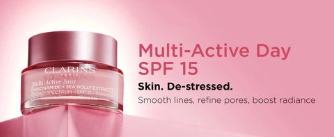Clarins Multi-Active Day Moisturizer SPF 15 targets the 8 signs of visible stress aging to smooth the look of lines, refine the appearance of pores, and support a strong moisture barrier for a healthy-looking glow.