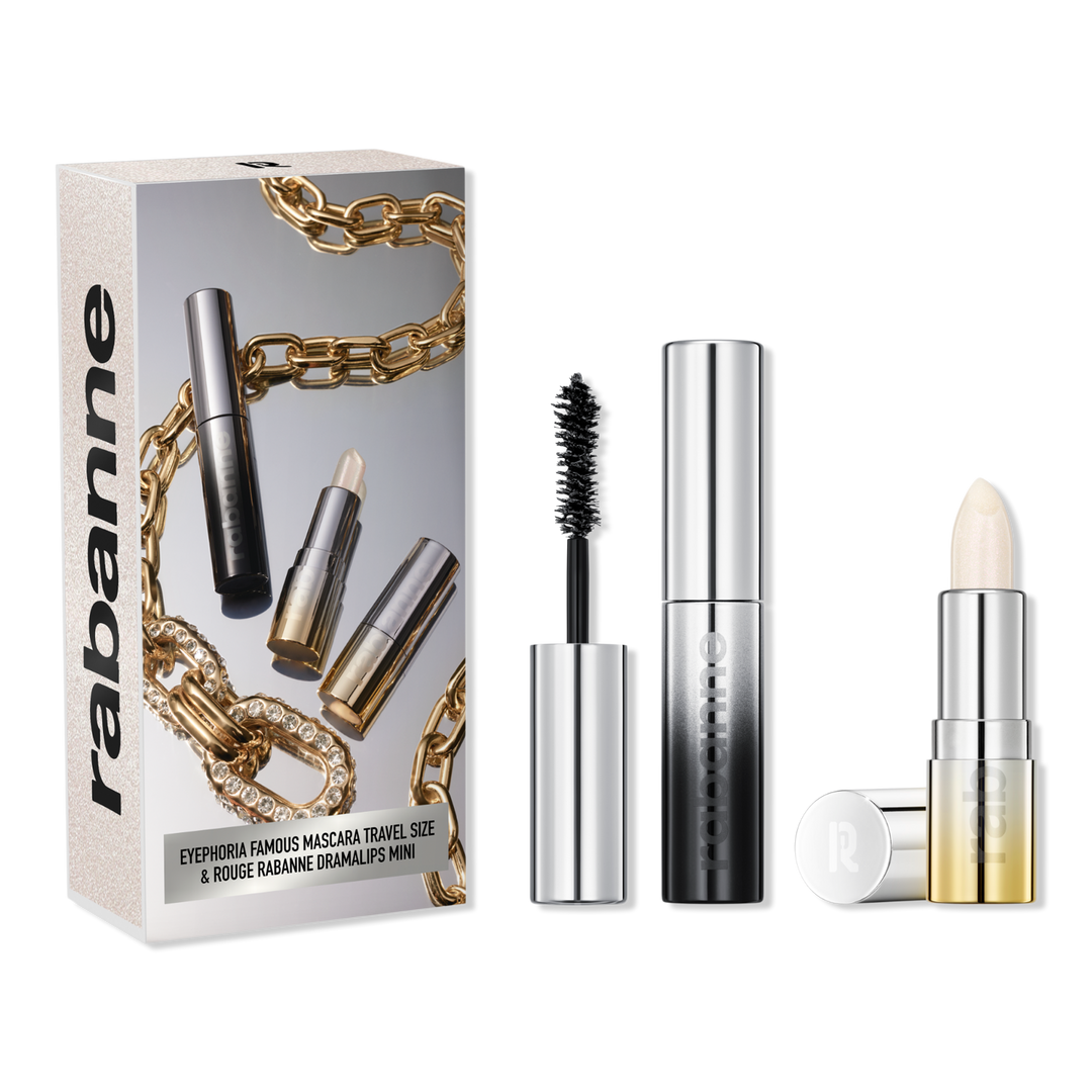Discover Rabanne with the Must Have Minis Famous Mascara & Dramalips Lipstick Set. Achieve bold, deep black lashes and icy pearly lips with hydrating, weightless vegan formulas. Pocket-sized for on-the-go glamour, these versatile shades are perfect for any look.