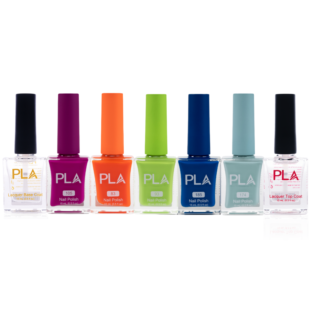 Achieve salon-quality manicures at home with the PLA Lacquer Starter Kit. This set includes Lacquer Base Coat , Lacquer Top Coat, and 5 nail polishes in a variety of shades. No UV lamp needed, giving you everything you need for easy, glossy, long-lasting color.