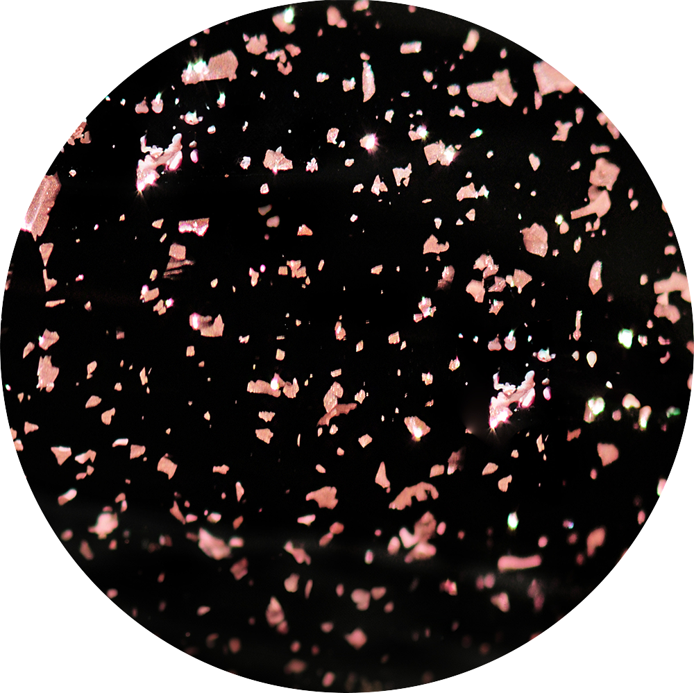 - Rose gold metallic asymmetrical foil flakes in a clear base.