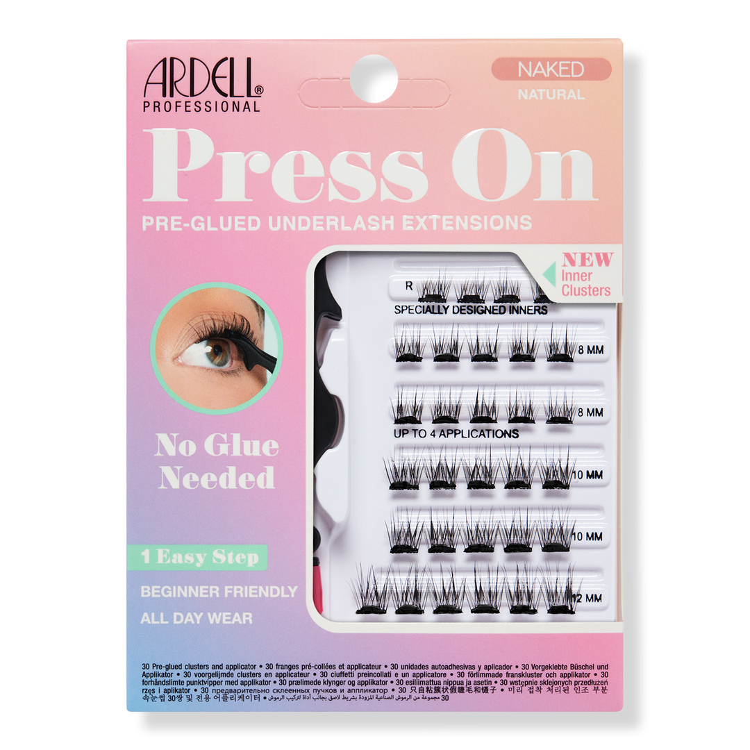 Get Naked underneath with Ardell's Naked Press On Natural, Lightweight Pre-glued Lashes. Barely-there & ready to wear, these pre-glued underlash extensions bring press-on ease and all-day hold to the lightweight Naked Lash Collection.